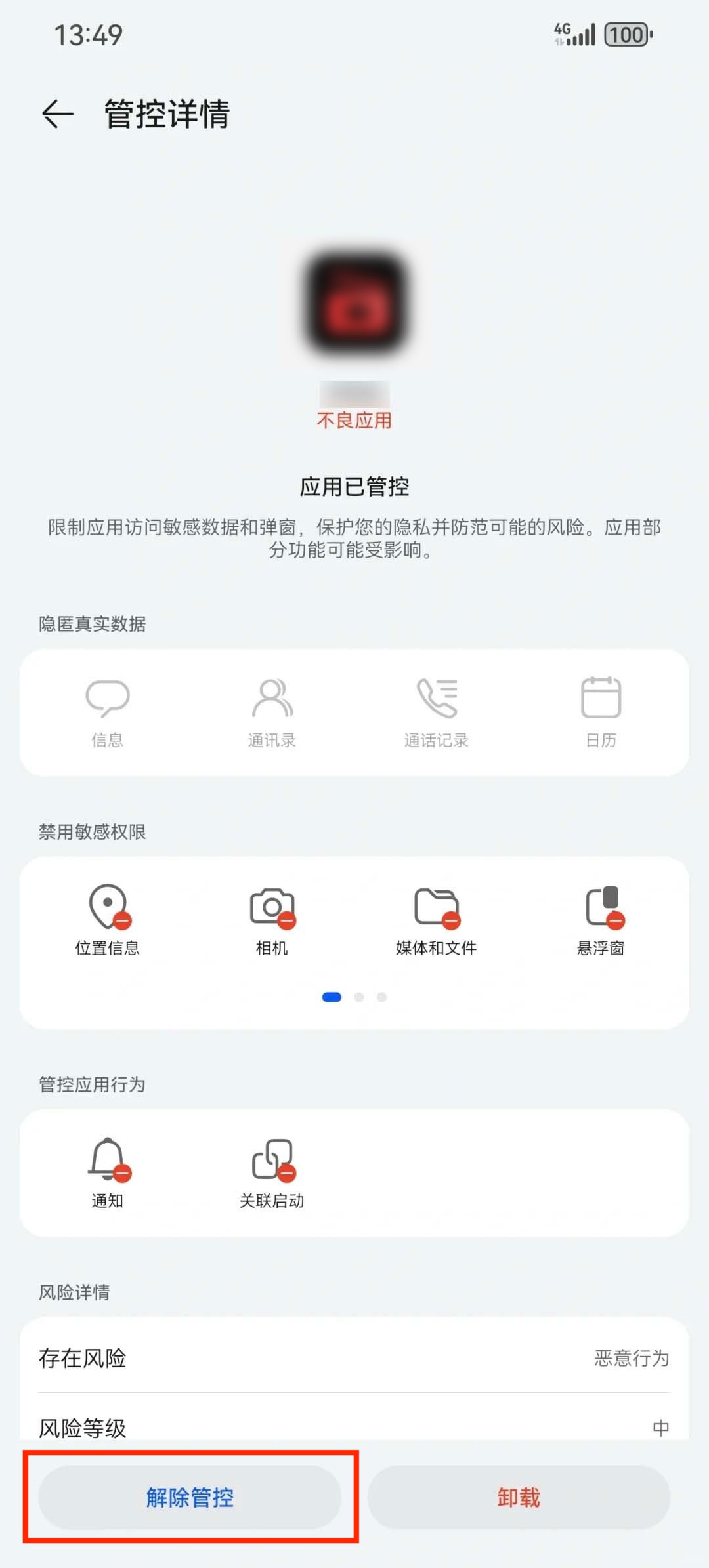 1.进入"手机管家" -> "病毒查杀" -> "风险/应用管控中心",检查应用是否在风险项中