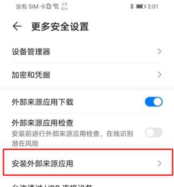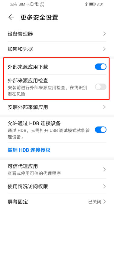 2.开启"外部来源应用下载",关闭"外部来源应用检查"